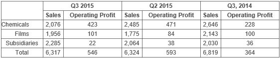 Q3 sales fell 7.4% to 631.7 billion won from the same period one year ago due to the establishment of MCNS, while the operating profit rose 50% to 54.6 billion won, helped by a rise in the operating profit in chemicals. Net profit increased 2,158.2% to 221.3 billion won due to one-time non-operating gains from the disposal of assets held for sale.