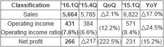 ● Following the transfer of the Polyol business to MCNS, which was founded in July 2015, sales decreased by 17.0% to 566.4 billion won while the operating income decreased by 24.5% to 43.1 billion, compared to the same period in the preceding year. However, the company posted a stable operating income ratio of 7.6% as its operating income increased by 12.2% over the preceding quarter.