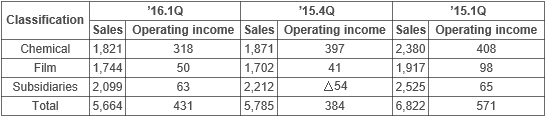 The unit posted a solid performance through its efforts to enhance its product portfolio and improve the profitability and sales of its highly functional products, including film for photo-voltaic applications, although its downstream industries including display and mobile products experienced slow business growth.
