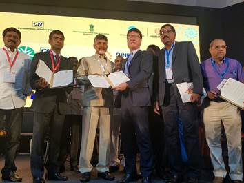 Seo Ho-seok, CEO of MCNS India corporation (fourth from left), poses with Nara Chandrababu Naidu, prime minister of Andhra Pradesh state after signing an MOU on January 28.