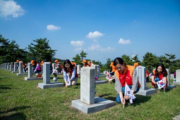 <SKC자원봉사단이 지난 30일 서울 동작구 국립서울현충원에서 태극기 꽂기 및 헌화 등 묘역 정화 사회공헌활동을 하고 있다.>
