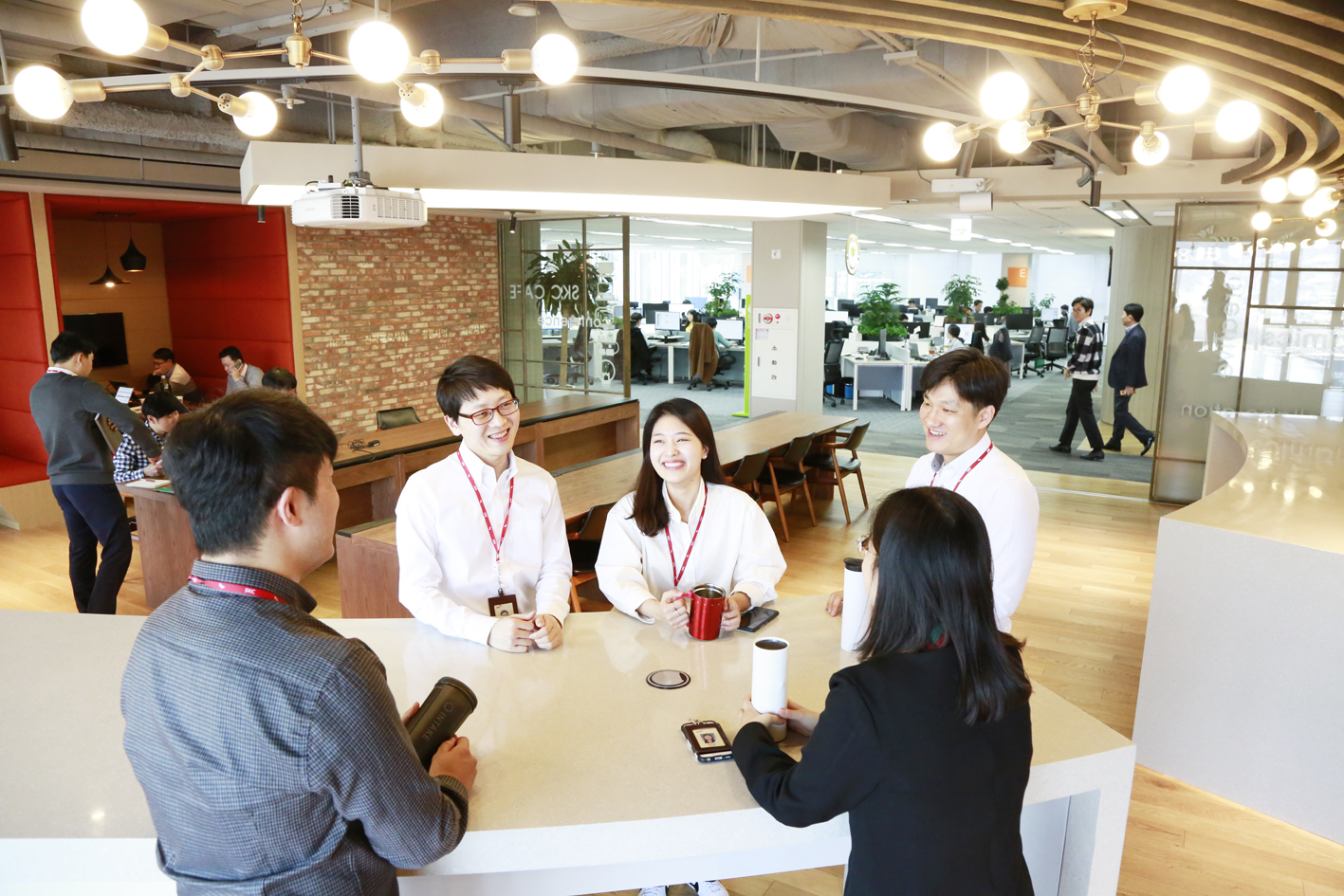 우선 기존 ‘팀-실-부문’ 단위별 지정좌석제 대신, 원하는 자리에 앉아 일하는 공유좌석제를 도입했다. 자리 사이의 칸막이는 없앴고, 공동업무공간인 프로젝트 룸을 34개로 두 배 늘렸다. 특히 각 층에 카페 못지 않은 휴식공간을 조성해 구성원 소통 공간을 확대했다.