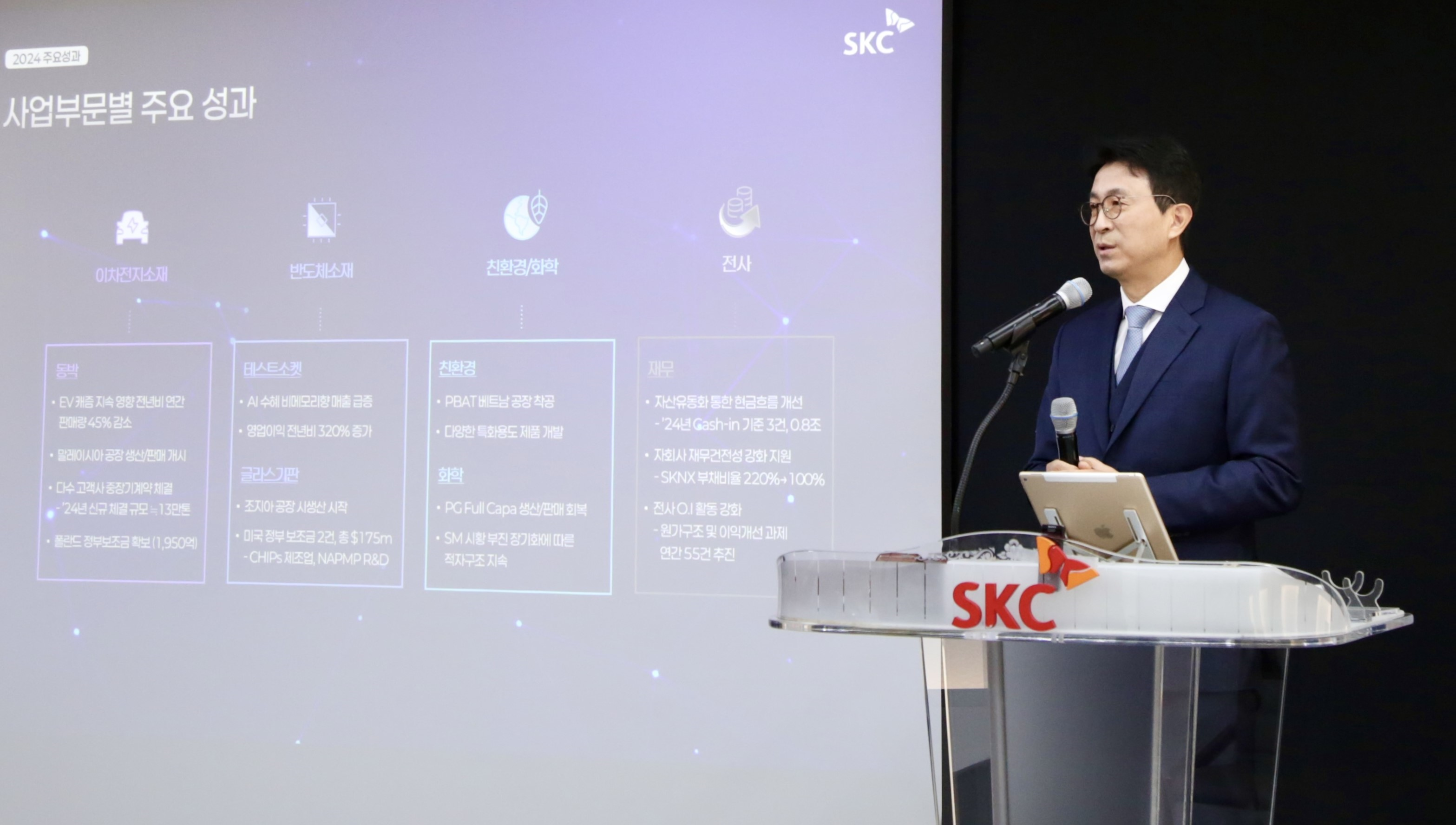 총회 의장을 맡은 박원철 SKC 사장은 “이차전지와 반도체, 친환경 3대 사업 축으로 포트폴리오를 개편하는 리밸런싱 1단계를 마무리했다”며 “글라스기판이라는 신사업 추진과 함께 반도체 테스트(test) 솔루션 분야 글로벌 기업인 ISC를 인수하며 반도체 포트폴리오 강화에 주력했다”고 말했다.