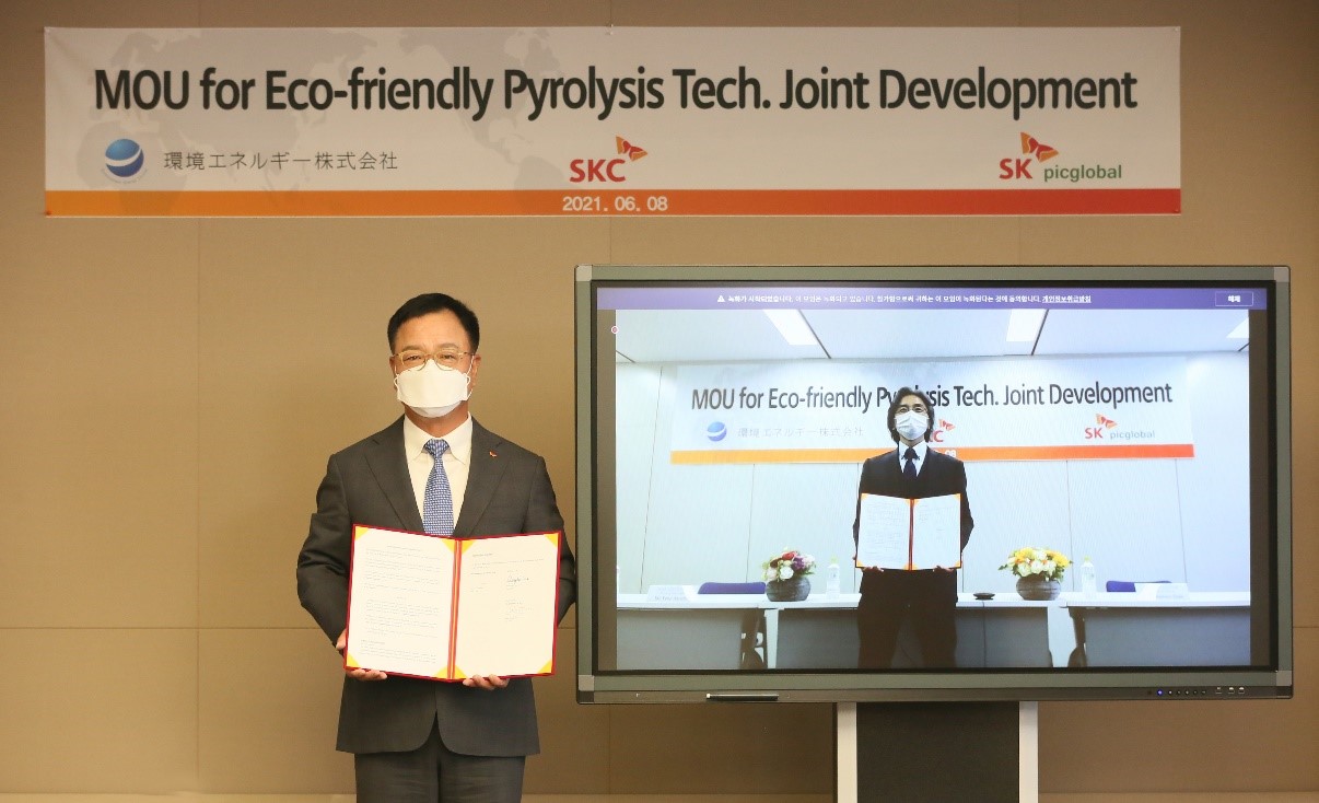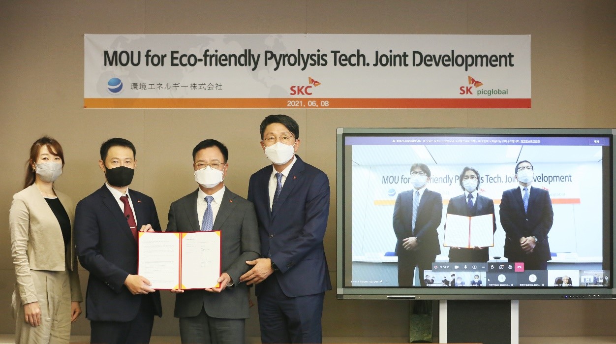 SKC held a videoconference with Kankyo Energy (Environment Energy in Japan on the 8th to sign the MOU on cooperation for technical development for the commercialization of pyrolysis on waste plastic. Two companies agreed on joint ownership of the technology and secured an exclusive license. SKC will add the know-how of the chemical business of SK picglobal (Investment Company) to the advance technology of Kankyo Energy for installing the pilot facility until this year and secure commercialization technology until the first semester of next year. The goal is to enable commercial operation by 2023.