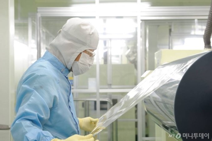 An employee is at the shatter-proof film production line of SKC hi-tech&marketing Cheonan Plant