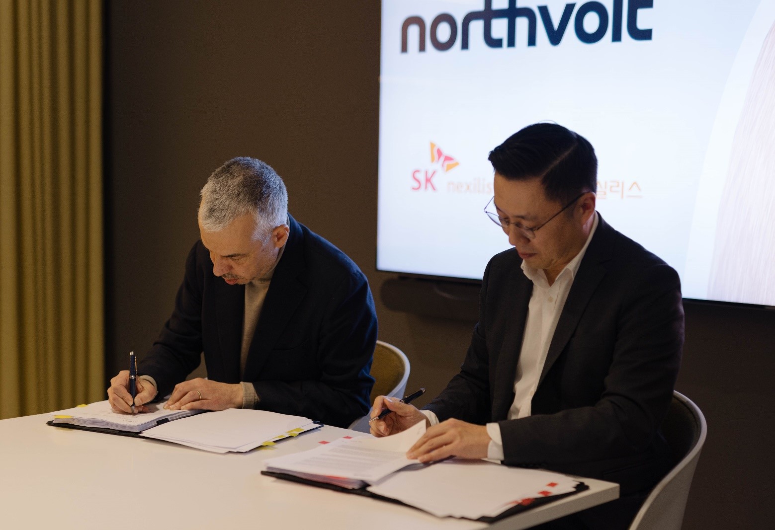 [SK nexilis signed a contract with Northvolt to supply cooper foil for rechargeable batteries in mid- to long-term. SK nexilis General Manager of Marketing Jeongkyu Kim (right) and Northvolt’s COO Paolo Cerruti are signing the contract at Northvolt headquarters in Stockholm.]